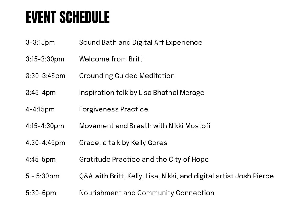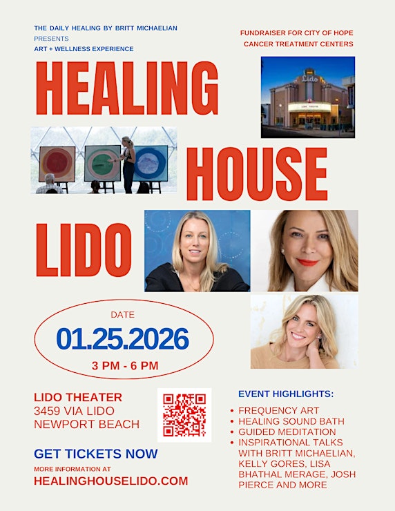 Held at the iconic Lido Theater located at 3459 Via Lido in Newport Beach, CA, the event will feature a curated lineup of wellness luminaries and art innovators. Attendees will embark on a sensory journey exploring Britt Michaelian's Daily Healing Method, which includes seven transformative practices: grounding, inspiration, movement, nourishment, gratitude, forgiveness, and grace. Highlights include a sound bath led by Marcelo Shriman with digital art immersion, guided meditations, a breathwork session with Nikki Mostofi, inspirational talks from Kelly Noonan Gores (of the HEAL documentary and podcast) and Lisa Bhathal Merage (Governor of the WNBA's Portland Fire and Portland Thorns women's soccer team), and a frequency art exhibit showcasing the collaborative works of Michaelian and Pierce.