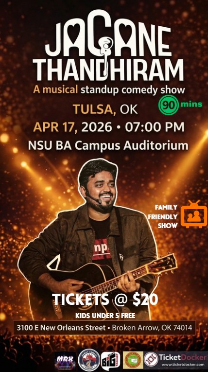 After winning hearts across India ๐ฎ๐ณ, the United States ๐บ๐ธ, Australia ๐ฆ๐บ, and the Middle East ๐, internationally touring stand-up comedian Jagan Krishnan ๐ค brings his most loved and personal show โJagane Thandhiramโ to Oklahoma ๐ for a special live performance.